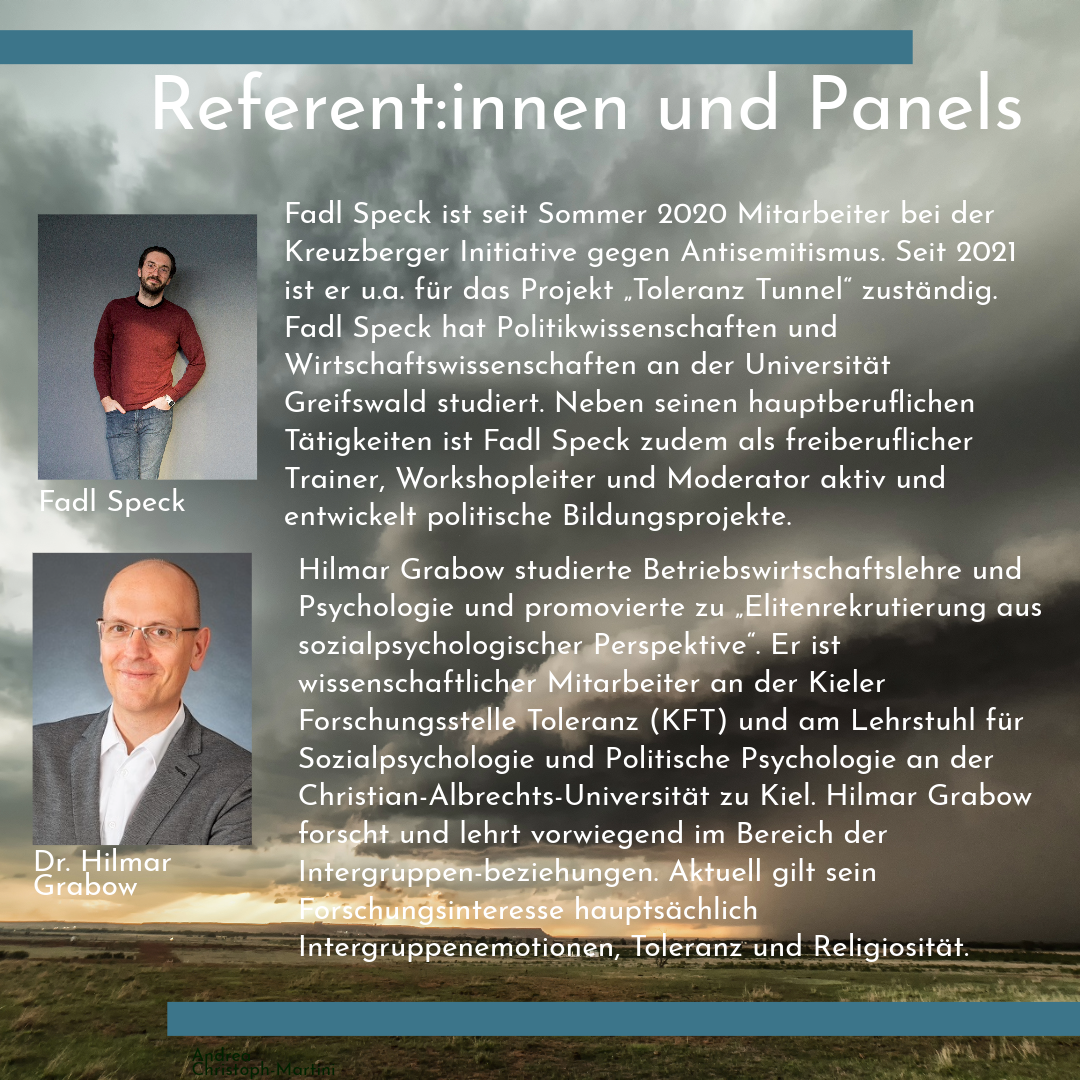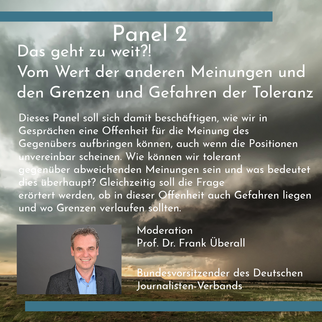 Wir möchten uns mit der Veranstaltung den Fragen nähern: Was ist eigentlich Toleranz und was bedeutet es wirklich tolerant in schwierigen Auseinandersetzungen/Diskursen zu sein? Sollte es Grenzen von Toleranz geben? Und wenn ja, wo verlaufen diese? Wir wollen sehen, wo im Widerstreit von diametral entgegengesetzten Positionen Chancen – und wo Risiken – für unsere Demokratie liegen. Und was der Unterschied zwischen einer abweichenden Meinung und Hass/Desinformation ist.