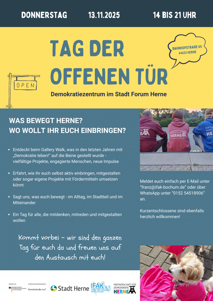 Am Donnerstag, 13. November 2025, von 14:00 Uhr bis 21:00 Uhr öffnen wir die Türen des Demokratiezentrums im Stadt Forum Herne (Bahnhofstraße 65, 44623 Herne).