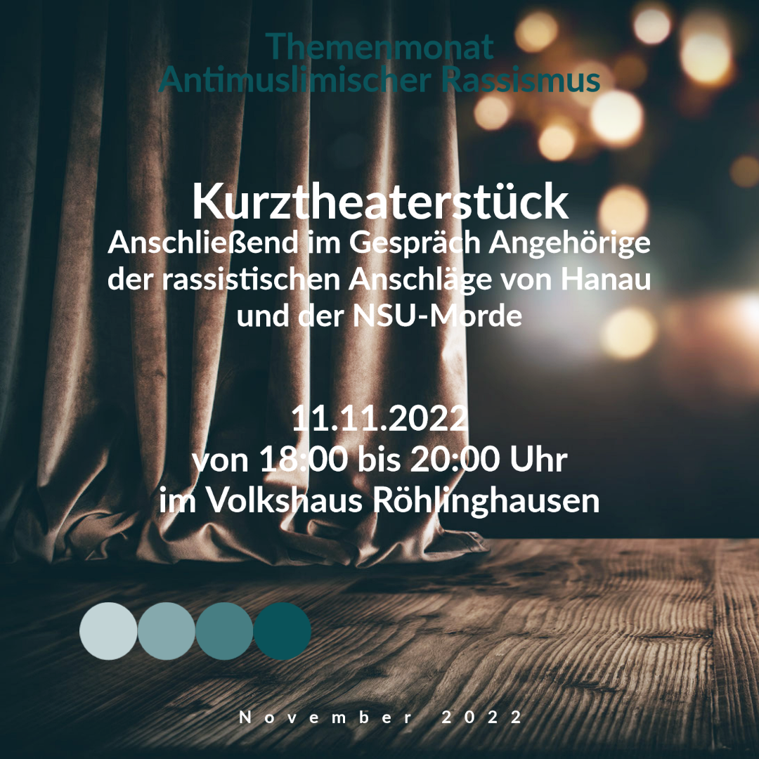 Die 2. Veranstaltung im Rahmen des Themenmonat Antimuslimischer Rassismus. Am 11.11.2022 wird es eine Theateraufführung geben, welche die Geschehnisse um einen rassistisch motivierten Mord nacherzählt. Im Anschluss an diese Aufführung wird es eine Podiumsdiskussion mit zwei Angehörigen der NSU-Morde und dem Anschlag von Hanau, sowie den beiden Darstellerinnen geben. Das Gespräch wird Tuncay Nazik moderieren. […]