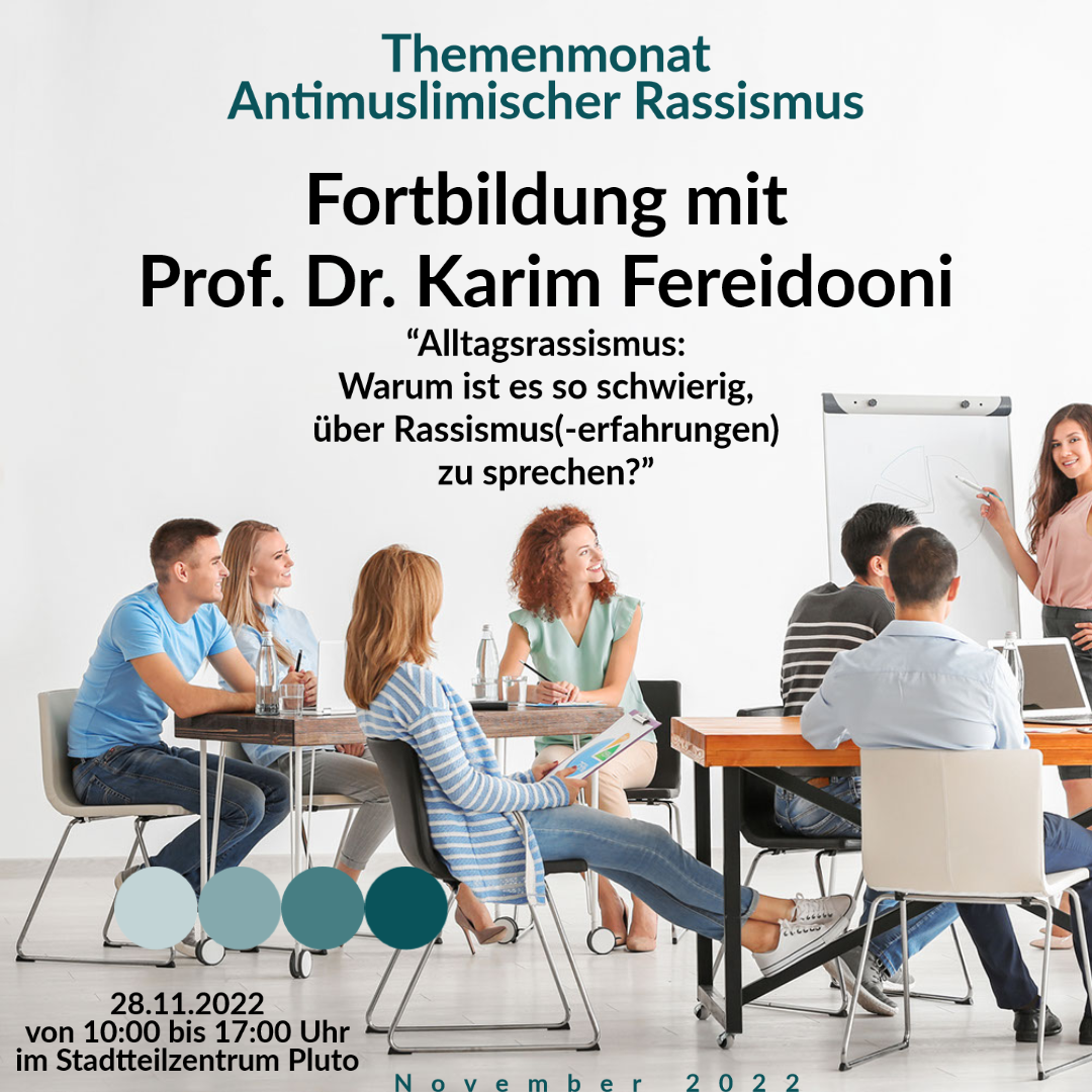 Anmeldung erforderlich! Die 4. Veranstaltung im Rahmen des Themenmonat Antimuslimischer Rassismus. Die Veranstaltungsreihe endet mit einer Fortbildung, die durch Herrn Prof. Dr. Karim Fereidooni zu dem Thema „Alltagsrassismus: Warum ist es so schwierig, über Rassismus(-erfahrungen) zu sprechen?“ stattfinden wird. -In diesem Workshop werden grundlegende Kenntnisse in Bezug auf die Entstehung und Weiterverbreitung von Alltagsrassismus in […]