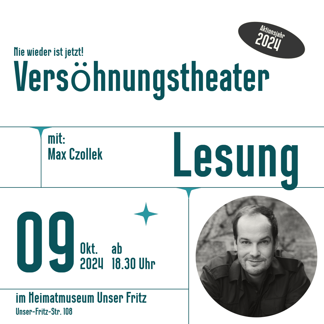 Im Rahmen des Herner Aktionsjahres "Nie wieder ist jetzt! Herne gegen Antisemitismus" wird Max Czollek im Heimatmuseum zu Gast sein. Dort wird er aus seinem Buch "Versöhnungstheater" lesen. Anmeldungen an franz@ifak-bochum.de (Kurzentschlossene sind auch willkommen!)